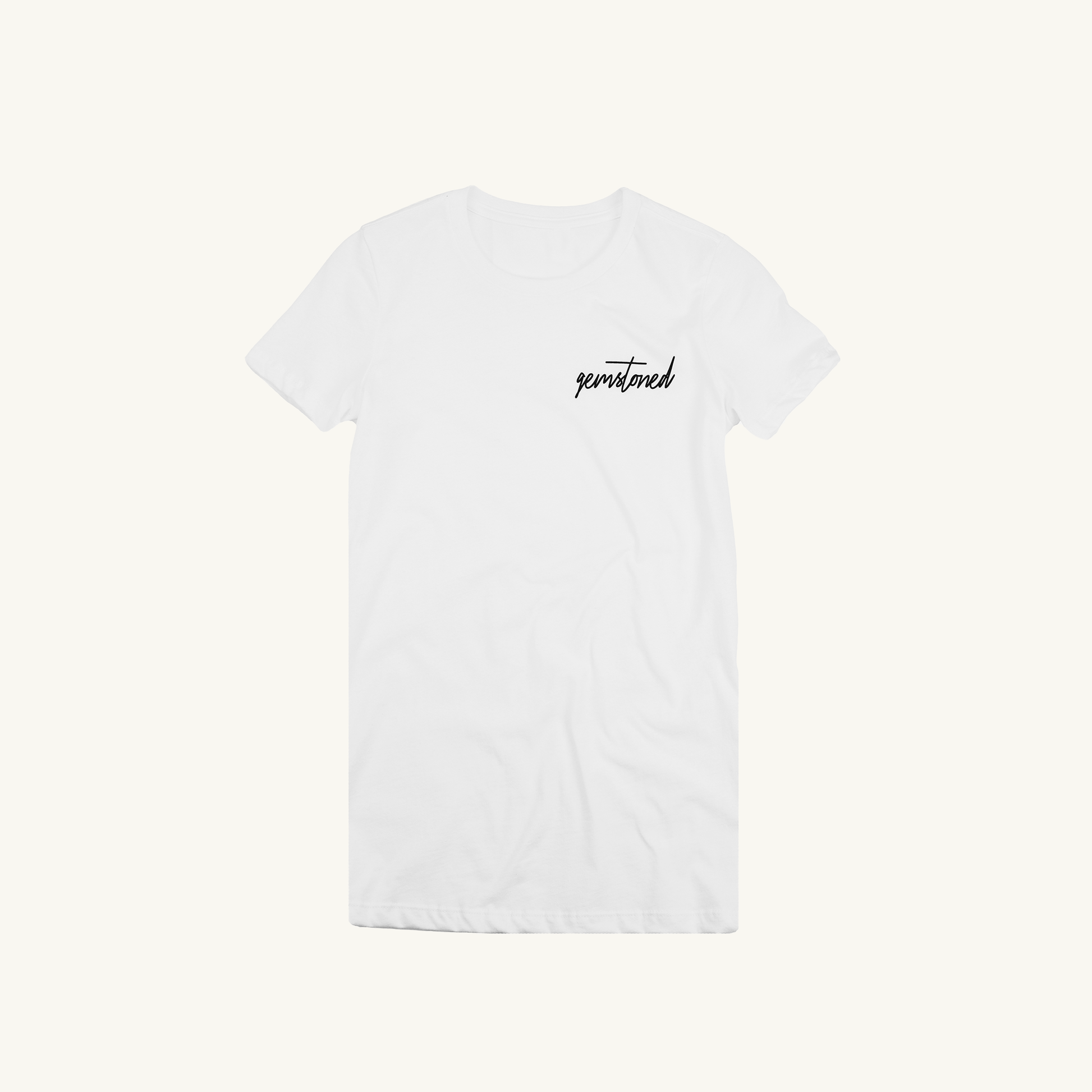An original design by Sarah Cameron Jewelry, this ultra soft, 100% cotton, classic white tee shirt features 'gemstoned' in black, cursive type.